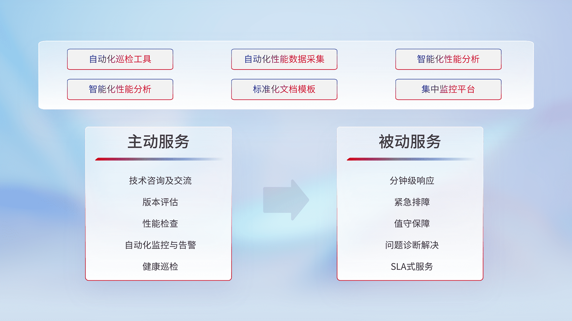 智能化工具和标准化文档,,,保障服务质量,,提供主动服务(包含技术咨询、、版本评估、、、性能检查、、、自动化监控与告警、、、健康巡检)和被动服务包含(分钟级响应、、、、紧急排障、、值守保障、、、问题诊断解决、、、SLA服务)。。。。